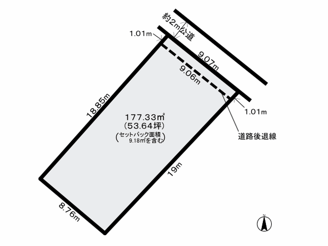 | 土地面積 | 177.33m²(53.64坪)※実測 (道路後退面積、約9.18m²を含む) |