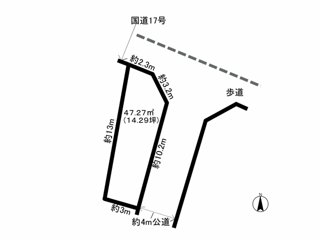 | 道路 | 北東側約25m公道(歩道付国道17号)南東側約4m公道 |